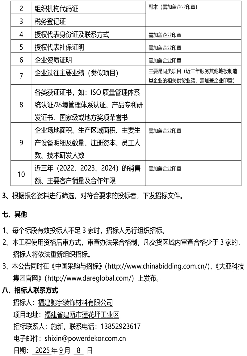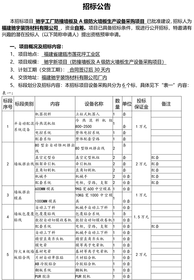 驰宇工厂防撞墙板及A级防火墙板生产设备采购项目招标公告