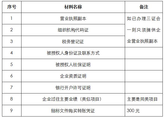 2、 凡有意向参加投标者,请在上述期间内按下表提供报名资料,相关证明文件的原件如无法提供原件则提供复印件加盖公司公章,投标人须将上述资料的扫描件发邮件至招标联系人处进行报名。