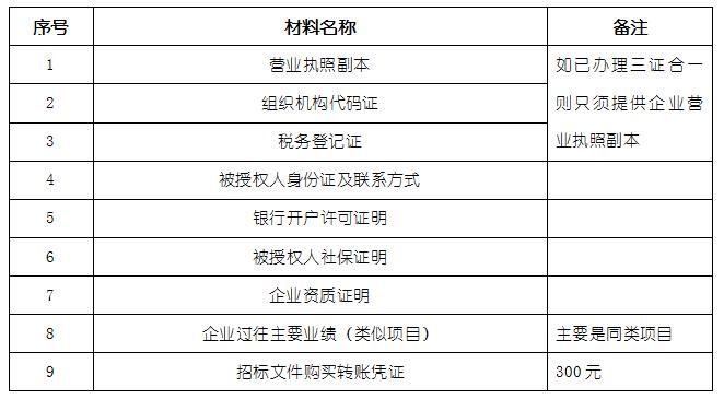 2、 凡有意向参加投标者,请在上述期间内按下表提供报名资料,相关证明文件的原件如无法提供原件则提供复印件加盖公司公章,投标人须将上述资料的扫描件发邮件至招标联系人处进行报名。
