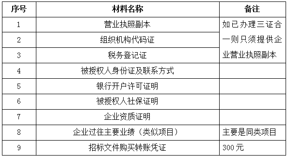 2、 凡有意向参加投标者,请在上述期间内按下表提供报名资料,相关证明文件的原件如无法提供原件则提供复印件加盖公司公章,投标人须将上述资料的扫描件发邮件至招标联系人处进行报名。
