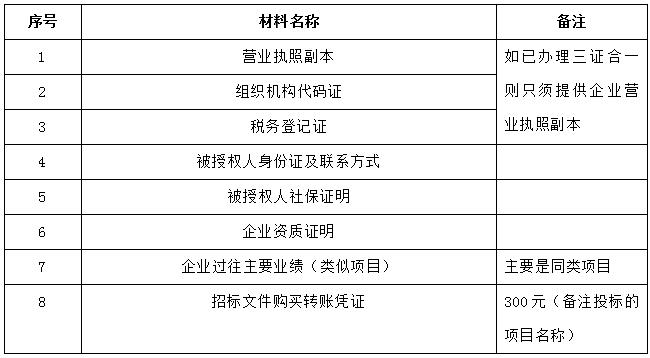 2、 凡有意向参加投标者,请在上述期间内按下表提供报名资料,相关证明文件的原件如无法提供原件则提供复印件加盖公司公章,投标人须将上述资料的扫描件发邮件至招标联系人处进行报名。