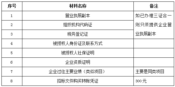 2、 凡有意向参加投标者,请在上述期间内按下表提供报名资料,相关证明文件的原件如无法提供原件则提供复印件加盖公司公章,投标人须将上述资料的扫描件发邮件至招标联系人处进行报名。