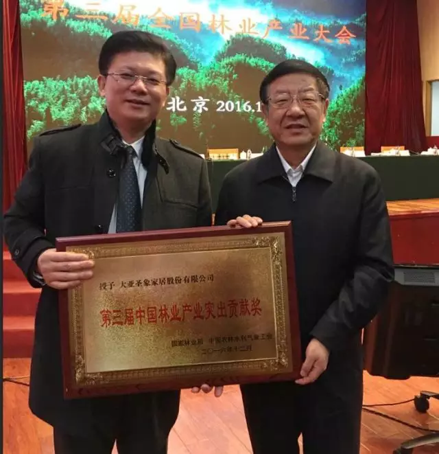 作为首批国家林业重点龙头企业,大亚科技集团有限公司应邀出席23日上午北京主会场现场大会。会上,大亚科技集团董事局主席、总裁陈晓龙先生获得“第三届中国林业产业突出贡献奖”个人奖荣誉,大亚圣象家居股份有限公司获得“第三届中国林业产业突出贡献奖”单位奖荣誉,大亚人造板集团副总裁程杰先生获得“第三届中国林业产业创新奖”个人奖荣誉。