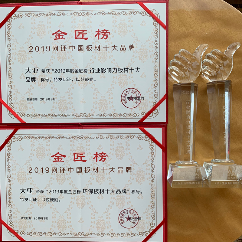 在9月2日晚举行的中国木业网2019中国板材“金匠榜”网络评选活动颁奖典礼上,大亚人造板又荣获“行业影响力板材十大品牌”及“环保板材十大品牌”两项殊荣,这是对大亚人造板的行业影响力和坚持绿色环保理念的肯定。